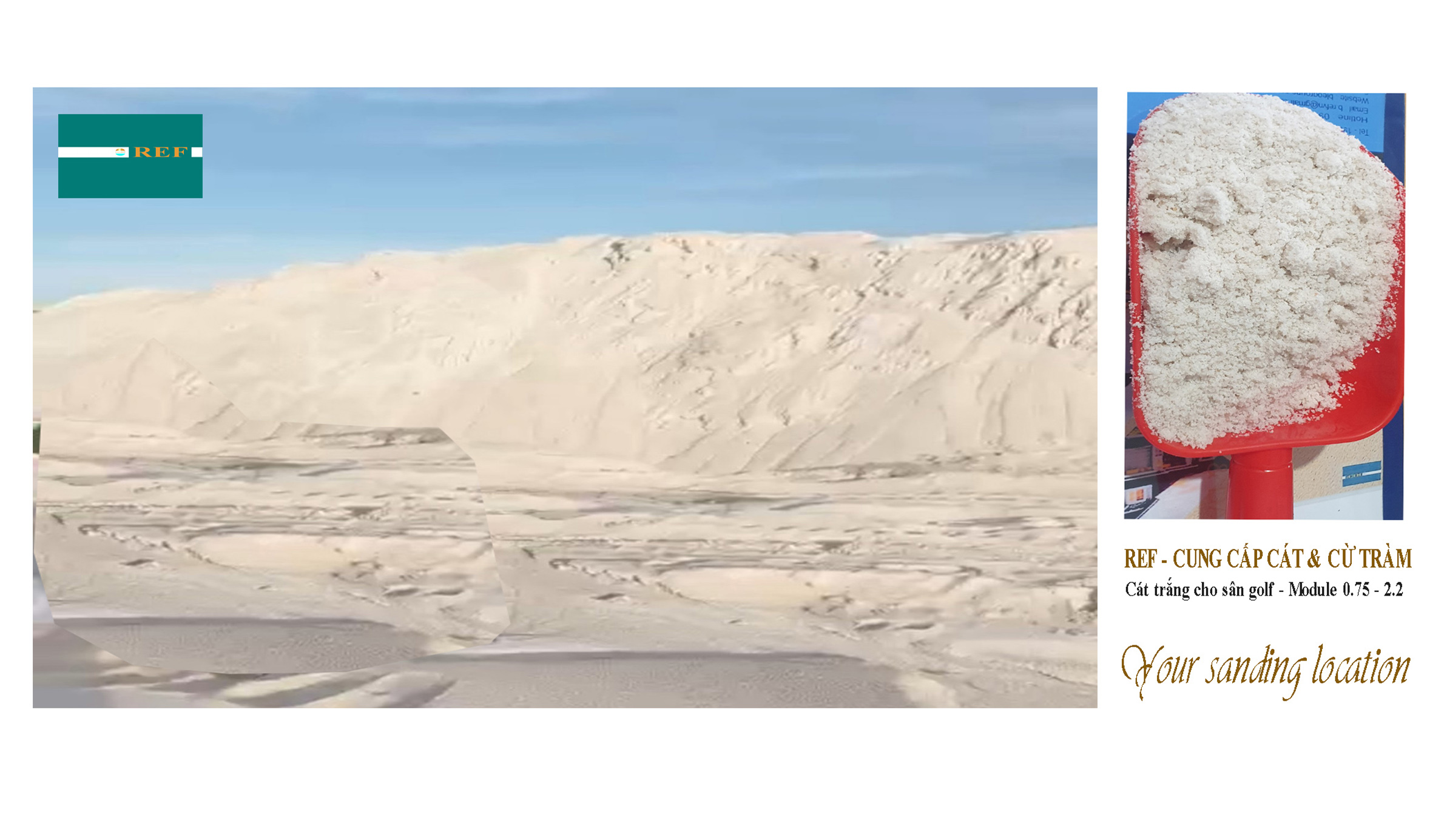 - REF là bộ phận kinh doanh về cát cho công trình trực thuộc BGI.INC được thành lập từ năm 2020. Nhiệm vụ chính là kinh doanh và nhập khẩu cát san lấp, Cát bê tông và Cát trang trí dành cho công trình, không xuất khẩu cát. Sàn phẩm cát nhập của chúng tôi đến từ Hai quốc gia Myanmar và Cambodia. Chúng tôi luôn tìm cách phục vụ khách hàng tốt hơn và mở rộng thị trường nhằm đáp ứng nhu cầu cát cho các công trình trong nước.
