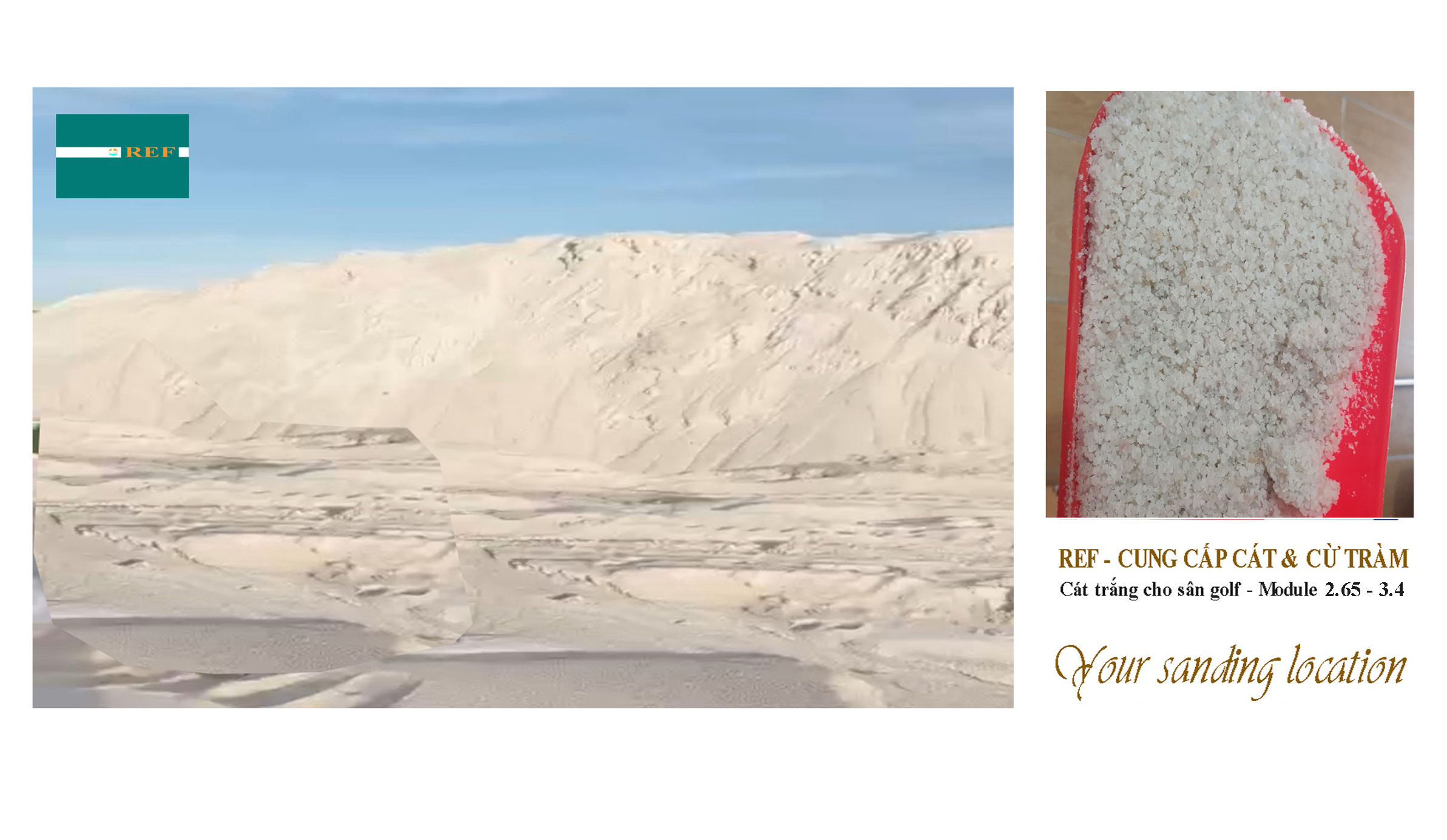 - REF là bộ phận kinh doanh về cát cho công trình trực thuộc BGI.INC được thành lập từ năm 2020. Nhiệm vụ chính là kinh doanh và nhập khẩu cát san lấp, Cát bê tông và Cát trang trí dành cho công trình, không xuất khẩu cát. Sàn phẩm cát nhập của chúng tôi đến từ Hai quốc gia Myanmar và Cambodia. Chúng tôi luôn tìm cách phục vụ khách hàng tốt hơn và mở rộng thị trường nhằm đáp ứng nhu cầu cát cho các công trình trong nước.
